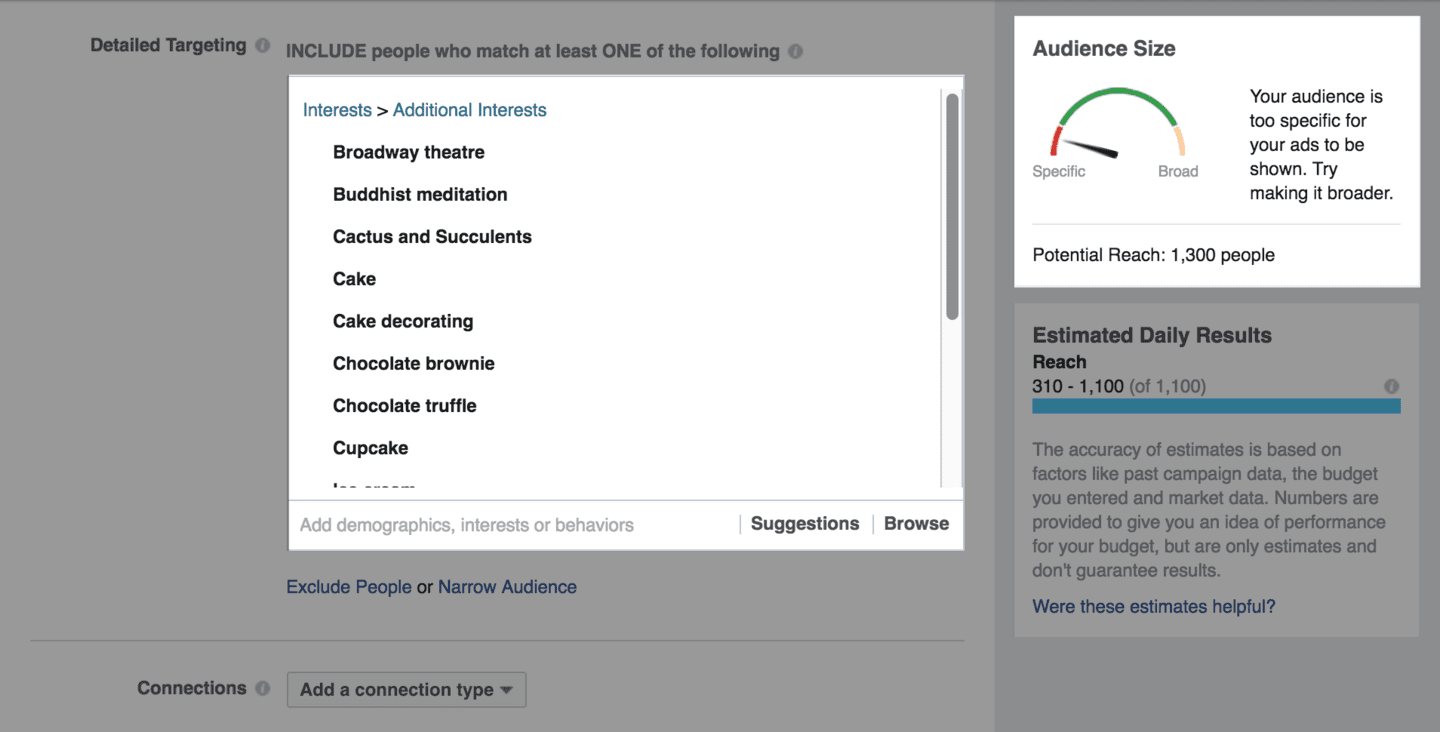 In the past, most advertisers were limited to being able to target single interests OR, single behaviours. This made core audiences wider, and therefore more suited for top of the funnel marketing than direct response marketing. These “wider” core audiences often had a lower relevance score on Facebook- which lead to higher advertising costs and less attractive ROI.